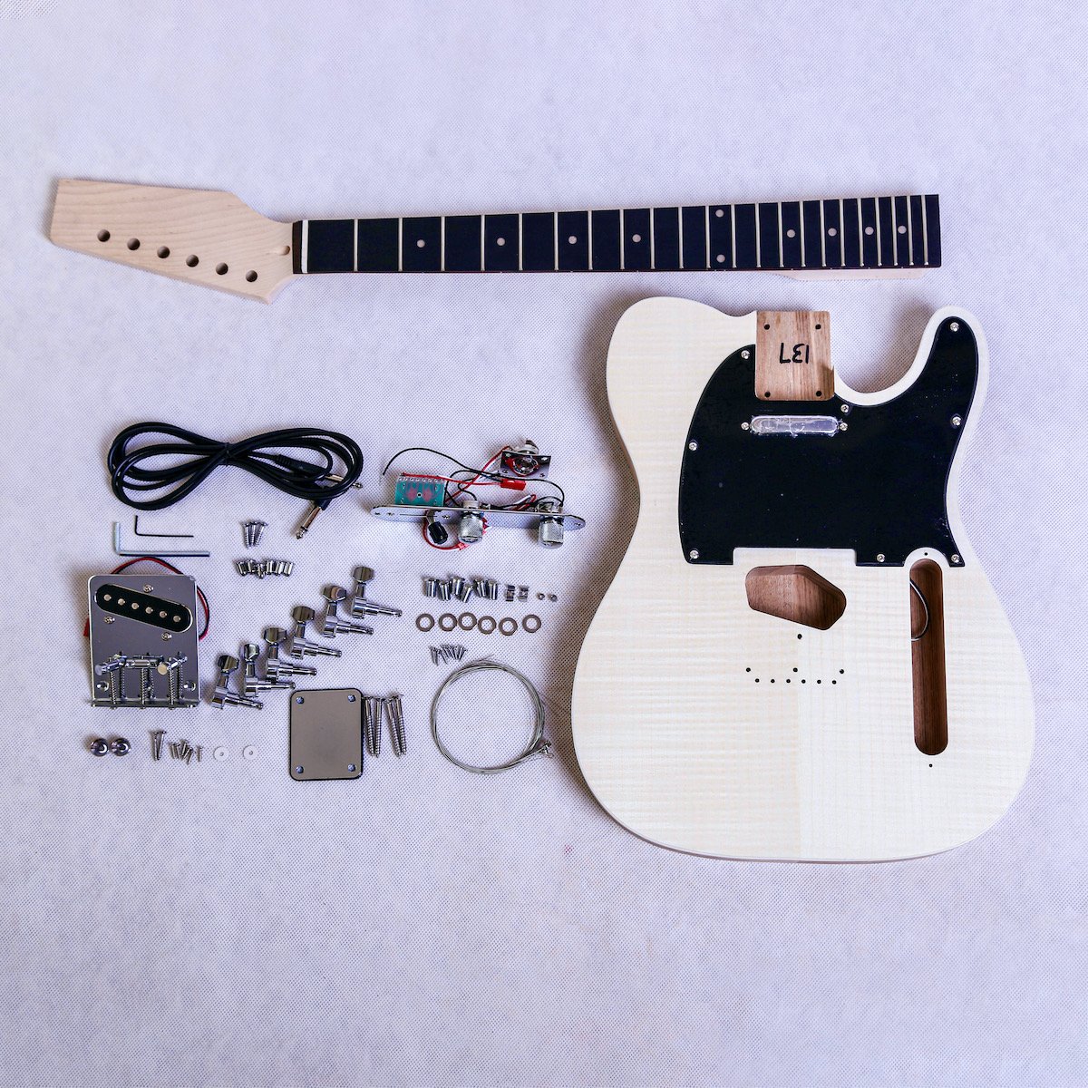 • Coban Guitars Electric Guitar DIY Kit TL60 Ash Body Flame Maple with Ebony Fingerboard Hardware Chrome Black Pickguard